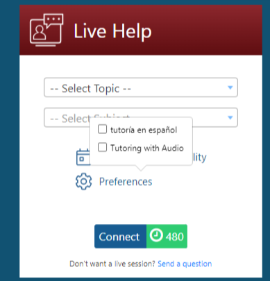 - Update your Live Help preferences by clicking on the "Preferences" button (small gear icon). You can choose to chat in Spanish or enable the audio option.